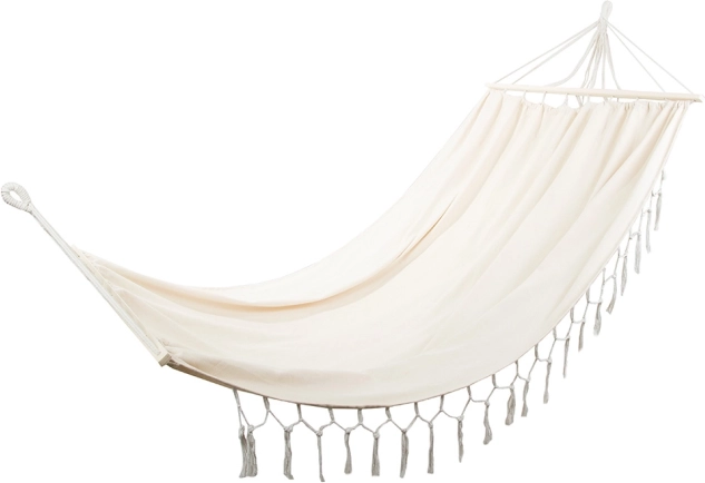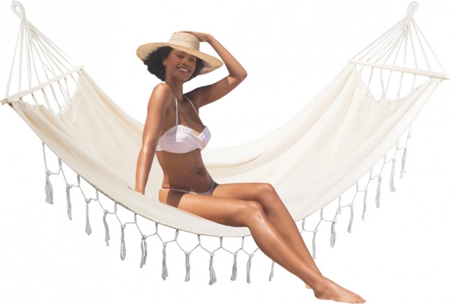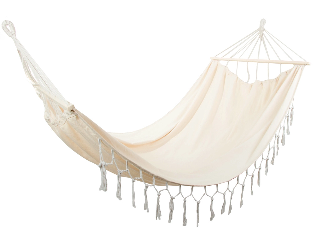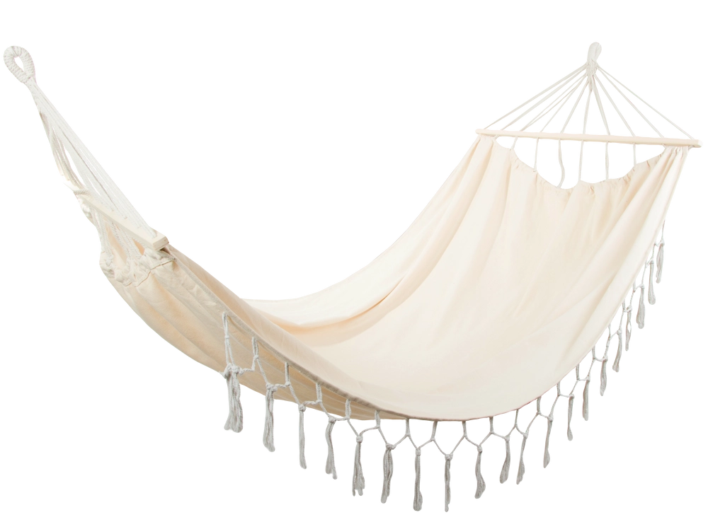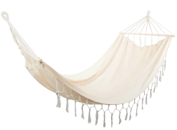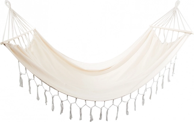 Mėgaukitės tobulu poilsiu gryname ore elegantiškame boho stiliaus dviviečiame hamake. Dėl erdvios 200 × 150 cm gulimosios dalies, iki 200 kg apkrovos ir dekoratyvinių kutų jis suteikia stilingą komfortą sode, terasoje ar namuose. Atsparus audinys, medinės skėtimosi lentelės ir tvirti kabinimo virvės užtikrina stabilumą ir lengvą pakabinimą.