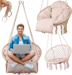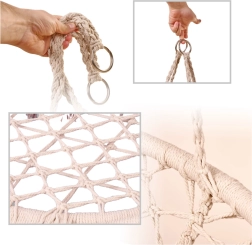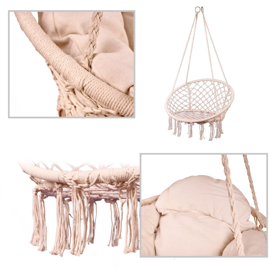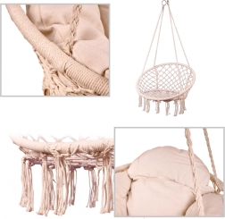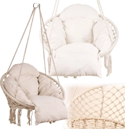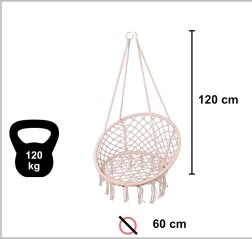 Ši pakabinama supama kėdė suteikia patogią sėdėjimo vietą poilsiui ir lengvam supavimuisi. Didelė apskrita forma ir minkšta pagalvė palaiko ergonomišką kūno padėtį, o tvirti medvilniniai lynai ir metalinis rėmas suteikia užtikrintumo ir ilgaamžiškumo.