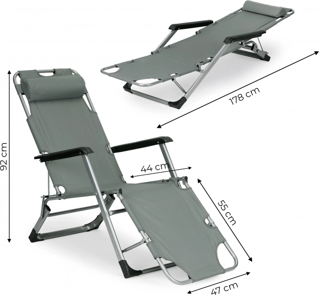 Mėgaukitės poilsiu lauke su stilingu MultiGarden 2 viename gultu, kuris tarnauja ir kaip patogi kėdė, ir kaip pilnavertis gultas. Dėl reguliuojamos atlošo padėties ir 3 lygių kojų atramos lengvai nustatysite idealią pozą. Lengva sulankstoma konstrukcija su patvariu metaliniu rėmu, vandeniui atspariu užvalkalu ir neslystančiomis kojelių antgaliais užtikrina stabilumą ir komfortą sode, terasoje ar paplūdimyje. Galvos pagalvėlė prilaiko kaklą ir didina poilsio komfortą. Didžiausia apkrova 150 kg.