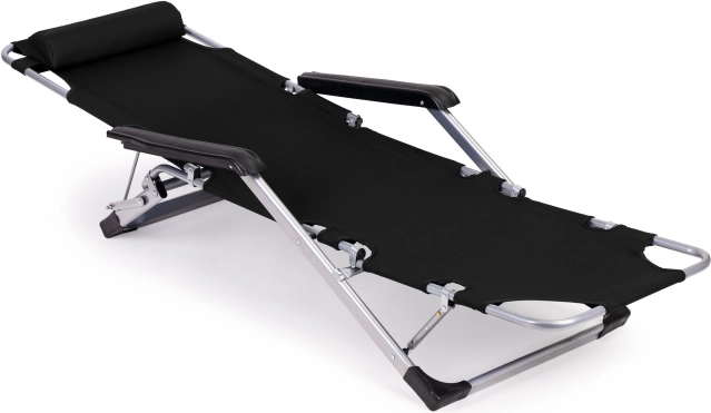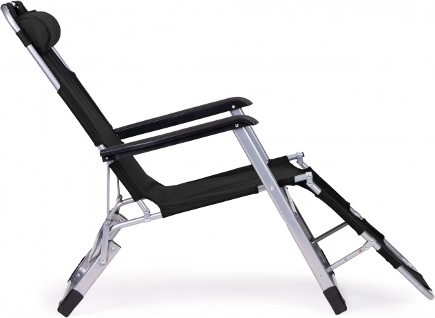 Ergonomiką papildo minkštas galvos atlošas kaklui ir galvai, 3 padėčių kojų atrama ir praktiški porankiai. Neslystančios kojelės saugo paviršių nuo įbrėžimų ir didina stabilumą ilsintis ar deginantis.