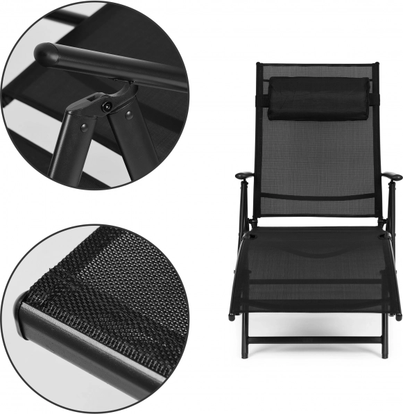 Stilingas juodas MULTIGARDEN gultas sukurtas patogiam poilsiui sode, terasoje ar prie baseino. Kvėpuojantis tekstilinis tinklas prisitaiko prie kūno ir užtikrina puikią ventiliaciją, o tvirtas milteliniu būdu dengtas plieninis rėmas suteikia stabilumą ir ilgaamžiškumą. Komplekte yra minkšta nuimama galvos pagalvėlė dar malonesniam poilsiui.