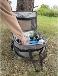 Pilkas 20 l termo krepšys idealiai tinka išvykoms, piknikams, prie vandens ir šaldytų produktų pirkiniams. Išorinis Oxford audinys yra patvarus ir atsparus vandeniui, vidų sudaro termoizoliacinė folija ir storos sienelės su EVA putomis, kurios veiksmingai stabilizuoja turinio temperatūrą. Vidus higieniškas, neabsorbuoja kvapų ir labai lengvai prižiūrimas.