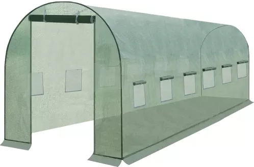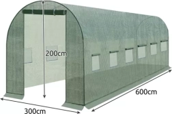 Patvari žalia pakaitinė plėvelė sodo tuneliui, kurio matmenys 6 × 3 × 2 m (18 m²), GARDLOV. PE 140 g/m² medžiaga su įlydyta armuojančia tinklelio struktūra yra atspari UV, atspari vandeniui ir nejautri ištempimui. Dvi įėjimo sekcijos su užtrauktukais ir šoniniai langai su tinkleliu nuo uodų užtikrina vėdinimą, drėgmės reguliavimą ir stabilų mikroklimatą spartesniam augalų augimui. Tik tentas – be konstrukcijos.