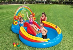 Platus pripučiamas vandens žaidimų parkas iš Intex pavers kiemą vasaros rojumi. Dvi baseino sekcijos, pripučiama čiuožykla su minkštu nusileidimu, vandens fontanas iš vaivorykštės lanko ir linksmi žaidimai (žiedai ir kamuoliukai) užtikrins valandas aktyvaus smagumo. Dėl didelės 297 × 193 cm aprėpties, išleidimo vožtuvo ir pridėtos taisomosios lopinės aikštelė yra praktiška, saugi ir pasirengusi karštoms dienoms.