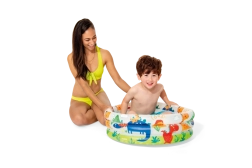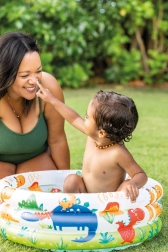 Intex pripučiamas baseinas su mielais dinozaurais idealiai tinka pirmiesiems vandens žaidimams vaikams nuo 1 iki 3 metų. Dėl 61 cm skersmens ir 22 cm aukščio jis telpa beveik visur ir suteikia saugią, seklą zoną žaidimams ir atgaivai karštomis dienomis.
