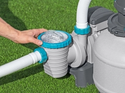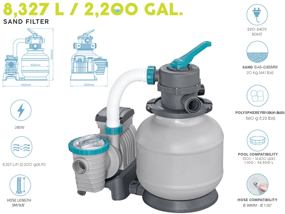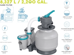 Smėlio filtras BESTWAY, kurio talpa 8327 l/val., užtikrina daugiaetapį vandens valymą ir reikšmingai sumažina baseino priežiūros poreikius. Dėl patvaraus, korozijai atsparaus rezervuaro ir viršutinio dangčio, besisukančio 360°, žarnų prijungimas yra greitas ir patogus iš bet kurios pusės. Tinka šeimos antžeminiams baseinams, kur reikalingas patikimas filtravimas ir didelis pralaidumas.