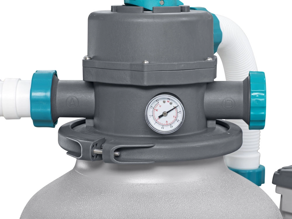 6 padėčių vožtuvas leidžia lengvai perjungti filtravimo, uždarymo, praplovimo, papildomo praplovimo, išleidimo ir cirkuliacijos režimus. Integruotas manometras suteikia greitą slėgio kontrolę, o tinklelinis priešfiltris apsaugo siurblio sparnuotę nuo didesnių nešvarumų (lapų ir pan.). Automatinis laikmatis palengvina darbo ciklų nustatymą.