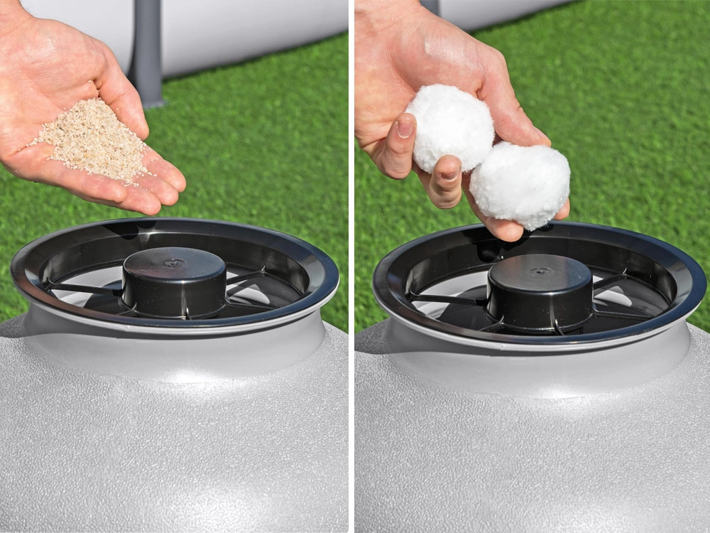 Galite rinktis tarp 0,45–0,85 mm kvarcinio smėlio ir filtravimo kamuoliukų, užtikrinančių didesnį efektyvumą ir lengvesnę priežiūrą.