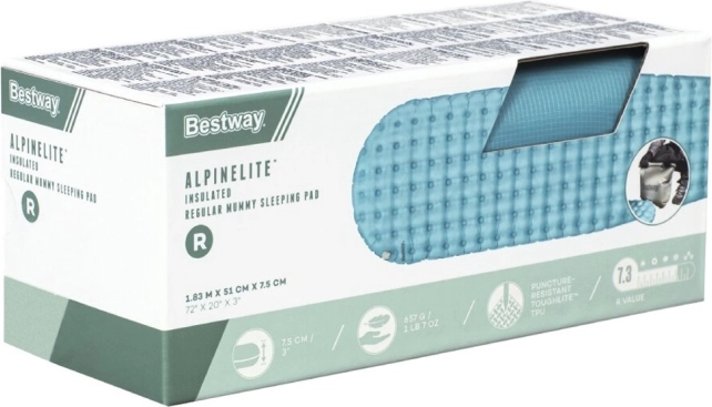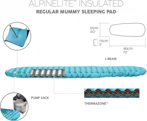 AlpineLite Insulated Regular Mummy karimatė – puikus pasirinkimas norintiems mėgautis komfortu ilsintis paplūdimyje, stovyklaujant ar nakvojant palapinėje. Pripūtimas lengvas ir greitas dėl novatoriškos AirCinch™ sistemos – tereikia spausti maišą delnais, ir karimatė greitai prisipildo oro. Rinkinys yra pilnas, tad nereikės jaudintis, kad pamiršite pompą.