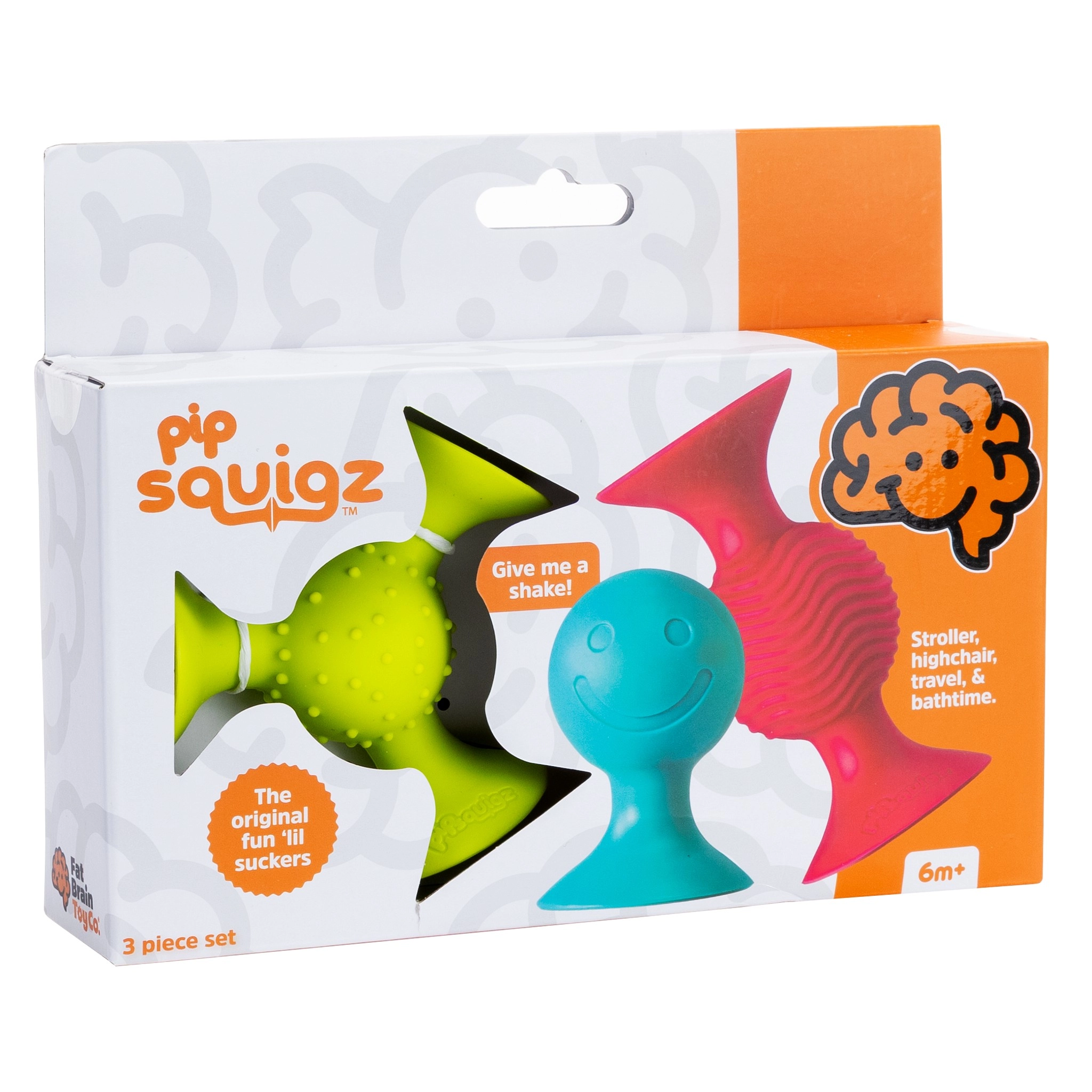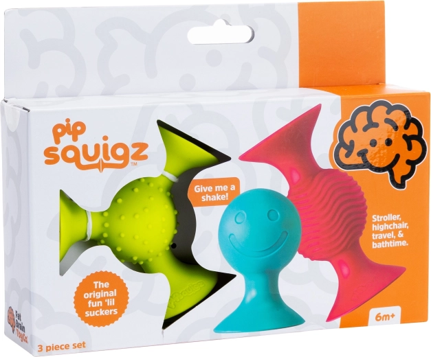 pipSquigz rinkinys (3 vnt.) suteikia vaikams begalę žaidimo galimybių namuose ir kelionėse. Kiekviena dalis pagaminta iš kokybiško, minkšto silikono ir turi siurbtukus, kurie patikimai laikosi ant lygių paviršių – ant valgės kėdutės, vonioje ar lange. Barškančios ir tekstūruotos dalys skatina suimti ir maigyti, taip natūraliai lavindamos motoriką ir pojūčius.