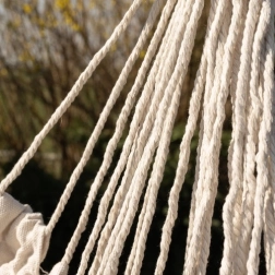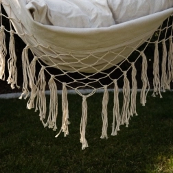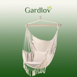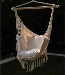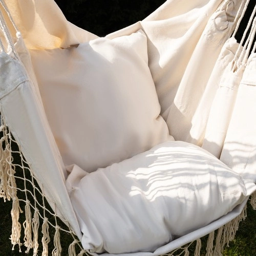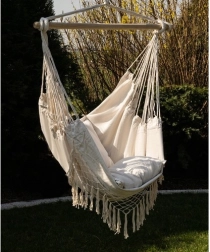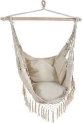 Ši patogi hamako tipo pakabinama kėdė kelia poilsį į naują lygį. Dėl medvilnės ir poliesterio derinio audinys malonus liesti, kartu tvirtas ir ilgaamžis. Medinė skersinė kartis ir tolygiai vedamos virvės užtikrina stabilią padėtį ir lengvą pakabinimą.