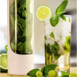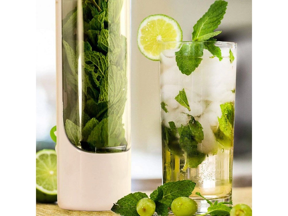 Žolelės stovi vandenyje ir išlieka sudrėkintos, todėl ilgiau išsaugo spalvą, aromatą ir skonį. Permatomas korpusas ir silikoninis kamštelis palengvina kontrolę ir papildymą.