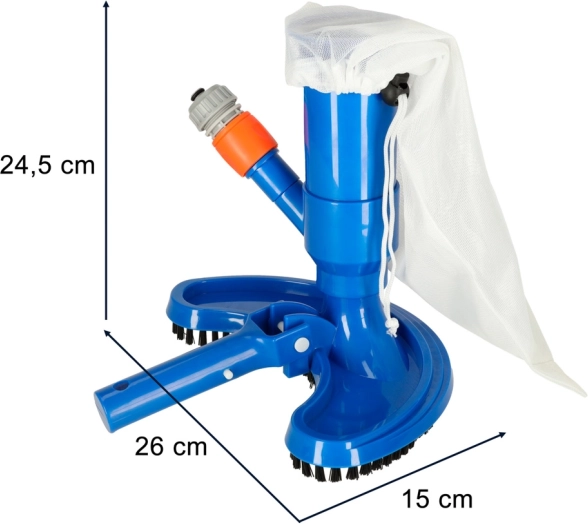 Rankinis baseino siurblys lengvam baseinų ir sodo tvenkinių dugno, sienų bei laiptelių valymui. Naudoja sodo žarnos vandens slėgį, o nešvarumus surenka į daugkartinio naudojimo tinklinį maišelį. Pusiau apvali galvutė su šepetėliais pasiekia net kampus, greitoji jungtis užtikrina greitą prijungimą, o paprastas naudojimas nereikalauja jokių įrankių.