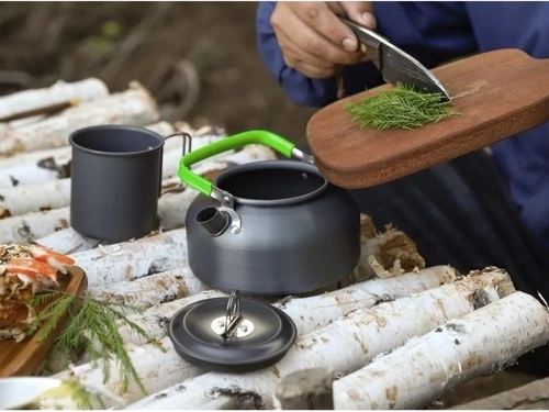 - Pilna komplektacija – puodas, keptuvė, arbatinukas su dangteliu, universali dangtis, 2x peilis, 2x šakutė, 2x šaukštas, 2x karabinas, 2x sulankstomas puodelis, 2x dėklas stalo įrankiams, transportavimo maišelis.