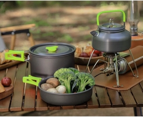 - Puodas, keptuvė, arbatinukas + dangtelis, universali dangtis, 2× peilis, 2× šakutė, 2× šaukštas, 2× karabinas, 2× sulankstomas puodelis, 2× dėklas stalo įrankiams, transportavimo maišelis