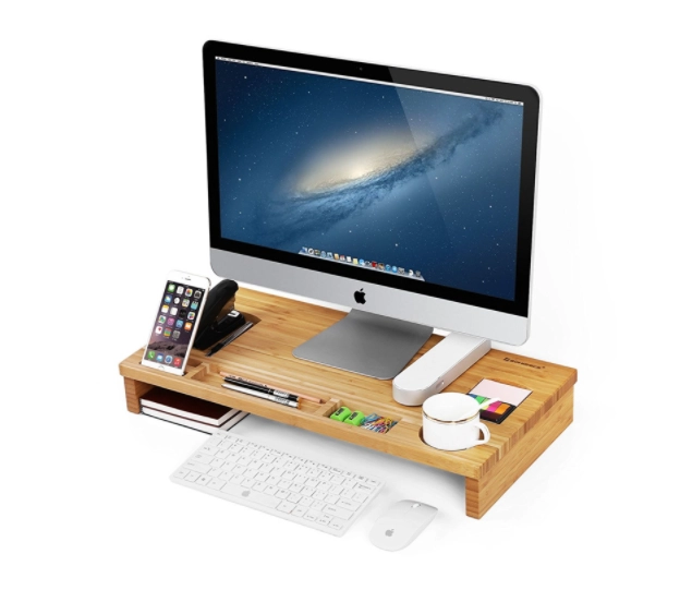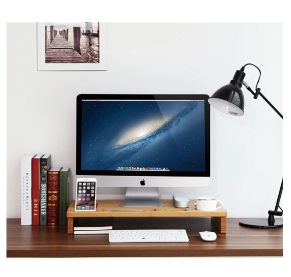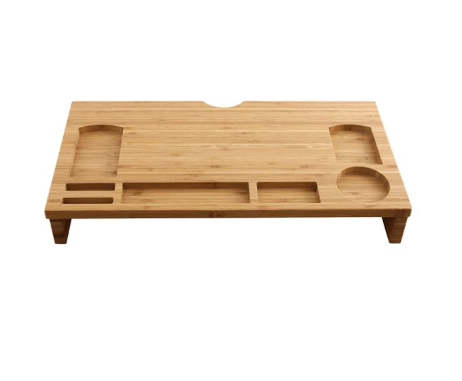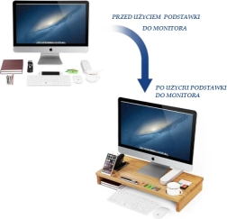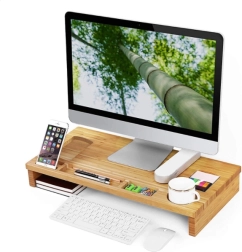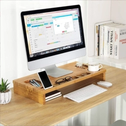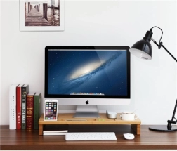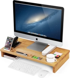 Elegantiškas bambukinis monitoriaus stovas pakelia ekraną į ergonomišką aukštį ir kartu veikia kaip praktiškas organizatorius. Siūlo skyrelius telefonui, pieštukams ir smulkmenoms, skirtą vietą puodeliui ir erdvę klaviatūrai bei pelei po stovu. Natūrali išvaizda ir patvarus bambukas užtikrina tvarką ant stalo ir patogesnę laikyseną dirbant.
