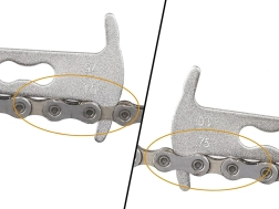 Matuoklis turi aiškiai įskaitomas žymas 0,75 ir 1,0 – jų dėka lengvai pamatysite, kada grandinė pasiekia tarnavimo ribą ir kada būtinas skubus keitimas.