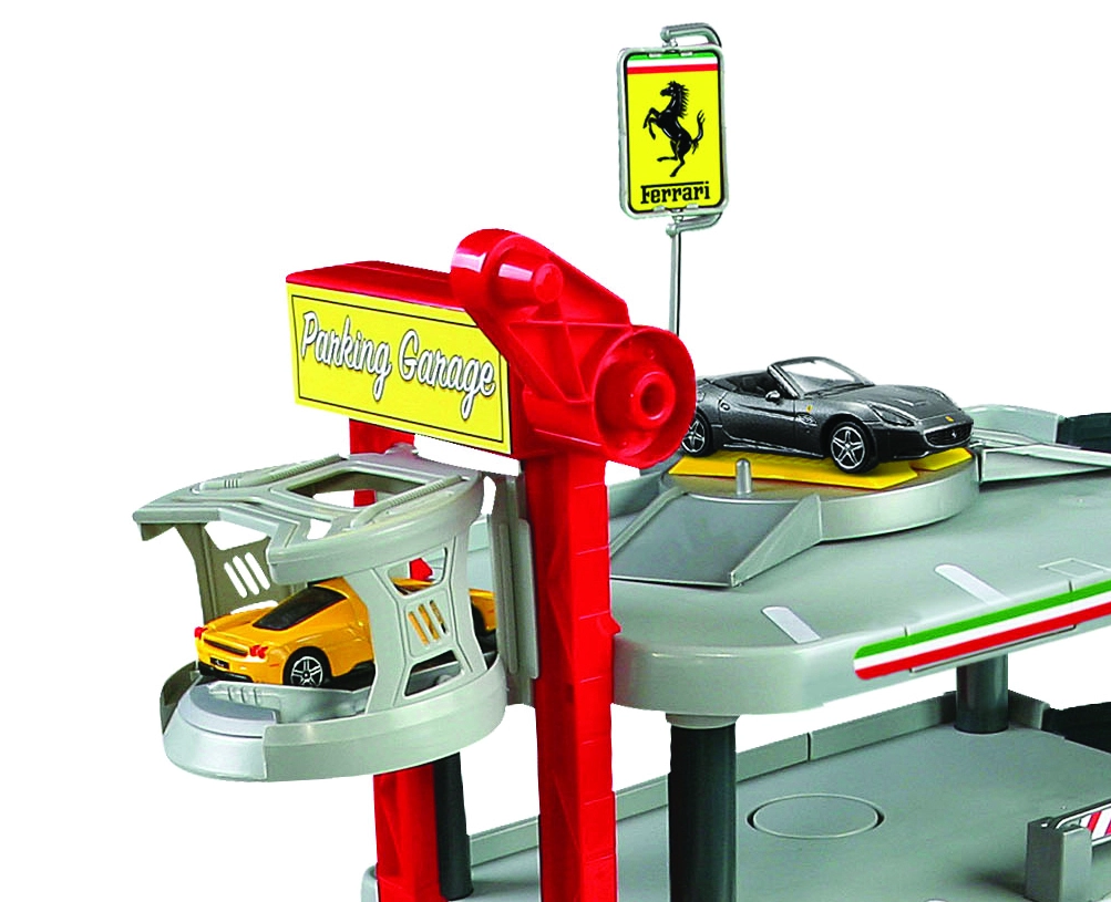 Trijų aukštų FERRARI Race & Play garažas vaikams suteikia autentišką lenktynių ir miesto eismo pasaulį. Pakelkite automobilį liftu į viršų, nuridenkite keliu, papildykite degalus, pravažiuokite plovykla ir valdykite pakeliamą užtvarą bei platformą. Dėl tvirtų ir spalvingų plastikinių detalių rinkinys lengvai surenkamas ir puikiai tinka kasdieniam žaidimui.