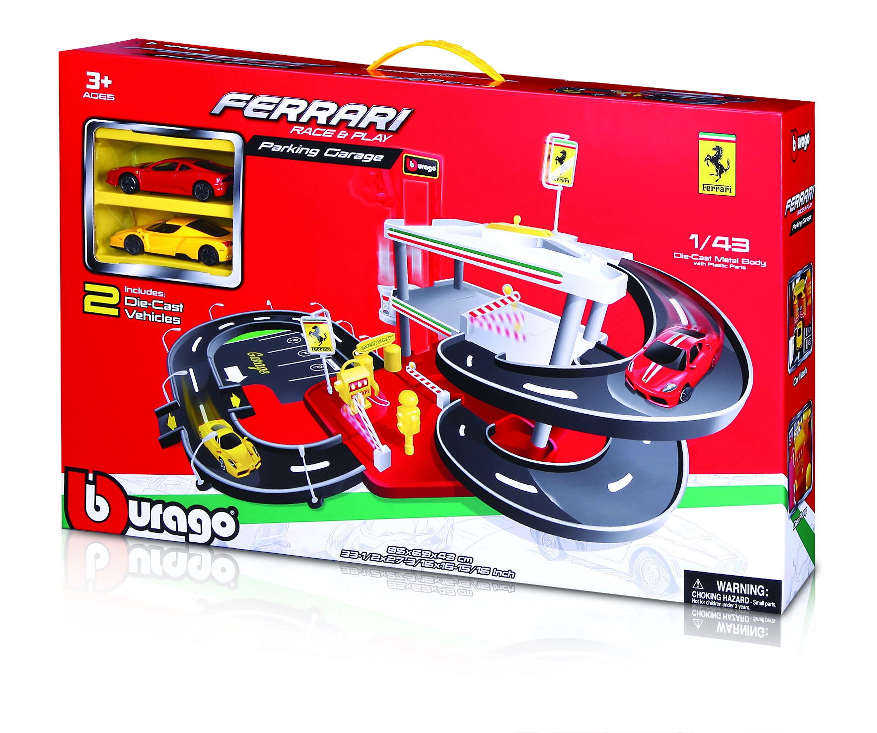 Atraskite pramogas per tris aukštus su FERRARI Race & Play garažu mažiesiems lenktynininkams. Rinkinyje yra veikiantis liftas, plovykla, degalų kolonėlės, kėlimo platforma ir du metaliniai FERRARI 1:43 modeliai. Spalvingos plastikinės dalys lengvai surenkamos ir išardomos, todėl vaikai mėgausis begalinėmis kūrybiško ir realistiško žaidimo valandomis.