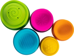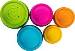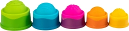 Atraskite smagų ir jutiminį žaidimą su Dimpl Stack stumiamosiomis skrybėlaitėmisFAT BRAIN. Rinkinyje yra 5 minkštos skrybėlaitės, kurias lengva suimti, sudėti ir spausti – idealu lavinti smulkiąją motoriką, akių–rankų koordinaciją ir jutiminį suvokimą.