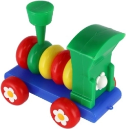 Traukinukas pagamintas iš plastiko ryškių spalvų, kurios traukia vaikų dėmesį, o ratai papuošti gėlių motyvais.