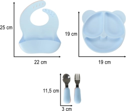 Rinkinys pagamintas iš aukštos kokybės maistinio silikono be kenksmingų medžiagų, yra malonus liesti, patvarus ir lengvai plaunamas. Meškučio formos skirstyta lėkštė palengvina tvarkingą patiekimą, seilinukas su gilia kišene padeda išlaikyti drabužius švarius, o ergonomiški įrankiai su minkštomis silikoninėmis rankenėlėmis puikiai tinka mažoms rankutėms.
