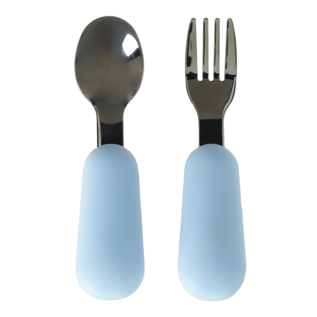Šaukštelis ir šakutė turi nerūdijančio plieno galvutes ir minkštas, neslidžias silikonines rankenėles, todėl vaikams patogiau laikyti ir lengviau naudoti.