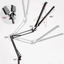 Reguliuojama svirtis leidžia sukti keliose plokštumose (360 / 225 / 270 / 135 laipsnių), kas padidina naudojimo lankstumą. Montavimas galimas tiek su spaustuvu, tiek ant stovo, todėl užtikrinamas universalus pritaikymas įvairiose aplinkose – namuose ar biure.