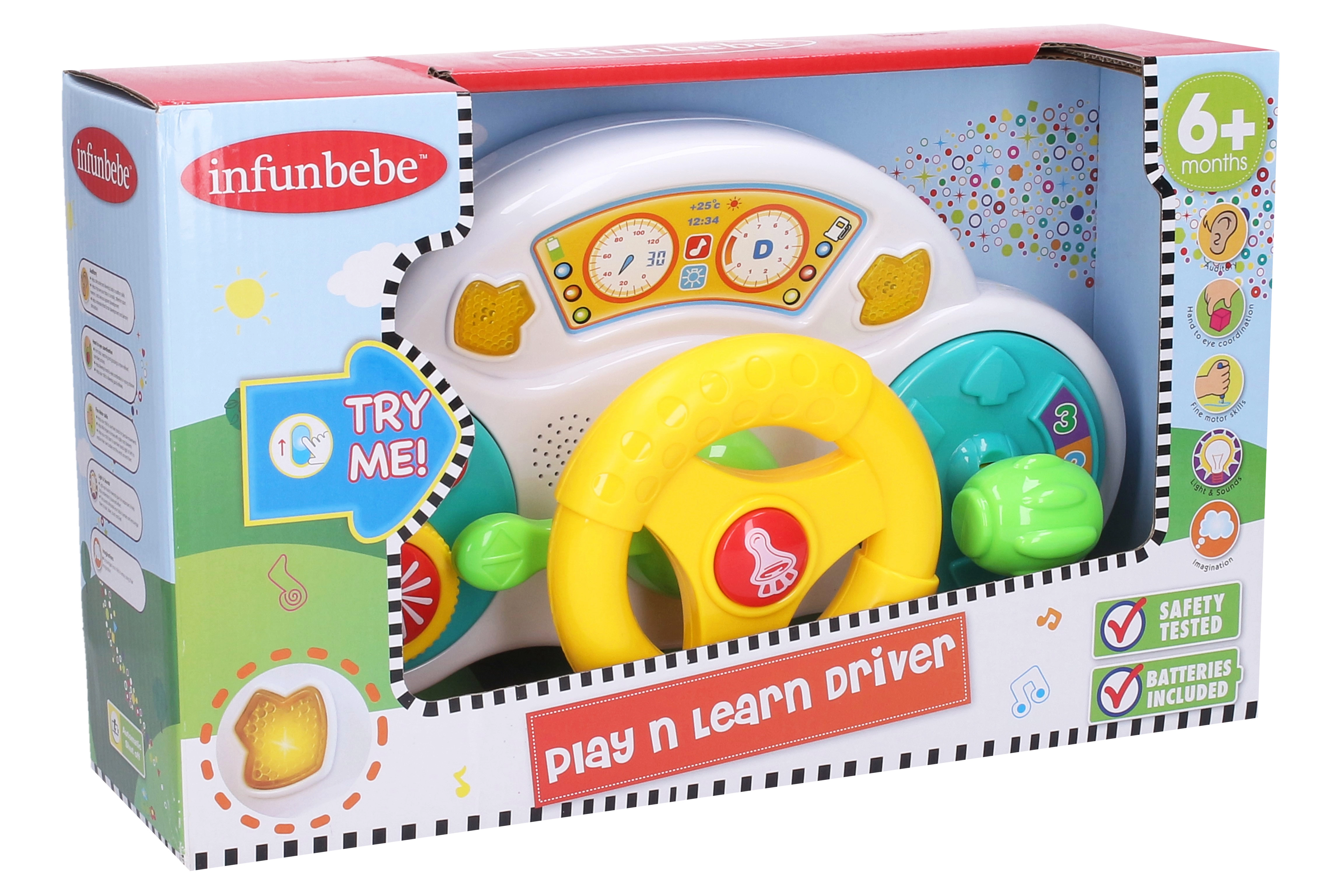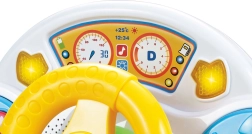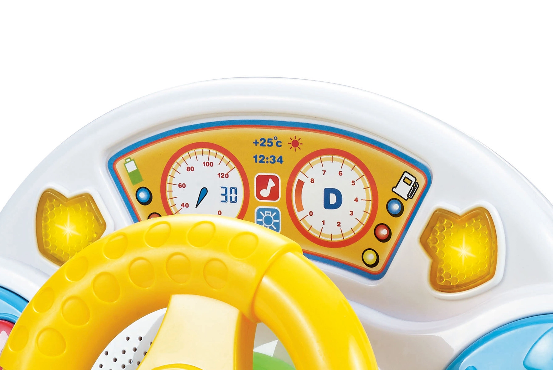 Linksmas interaktyvus vairas mažiausiems vairuotojams siūlo šviesos ir garso efektus, lavina smulkiąją motoriką, formų ir spalvų suvokimą ir skatina vaizduotę. Dėl paprasto valdymo ir aiškių mygtukų puikiai tinka namuose ir kelionėse.