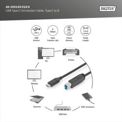 Aukštos kokybės USB 3.0 kabelis su USB‑C (vyr.) – USB‑B (vyr.) kištukais skirtas prijungti pagrindinius įrenginius (kompiuterį, nešiojamąjį, USB skirstytuvą) prie periferinių įrenginių su USB‑B lizdu, tokių kaip išoriniai HDD dėklai, skaitytuvai ar spausdintuvai. Dėl USB 3.0 standarto pasiekiamas SuperSpeed perdavimas iki 5 Gbit/s, tai iki 10× greičiau nei USB 2.0, todėl tinka sparčioms atsarginėms kopijoms ir sklandžiam darbui su dideliais failais.