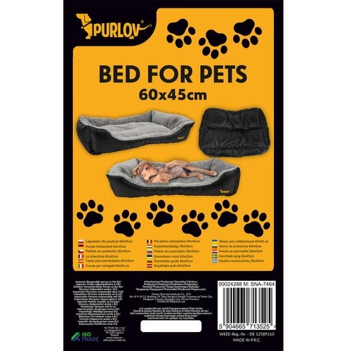 Purlov guolis, kurio dydis 60 × 45 cm (išoriniai matmenys 65 × 50 × 13 cm), sukurtas patogiam mažų ir vidutinio dydžio veislių miegui. Švelnus pilkas vidus ir patvarūs juodi borteliai užtikrina komfortą, atramą ir ilgaamžiškumą. Dėl žemos įlipimo vietos į guolį lengvai pateks ir šuniukai, ir vyresni gyvūnai.