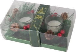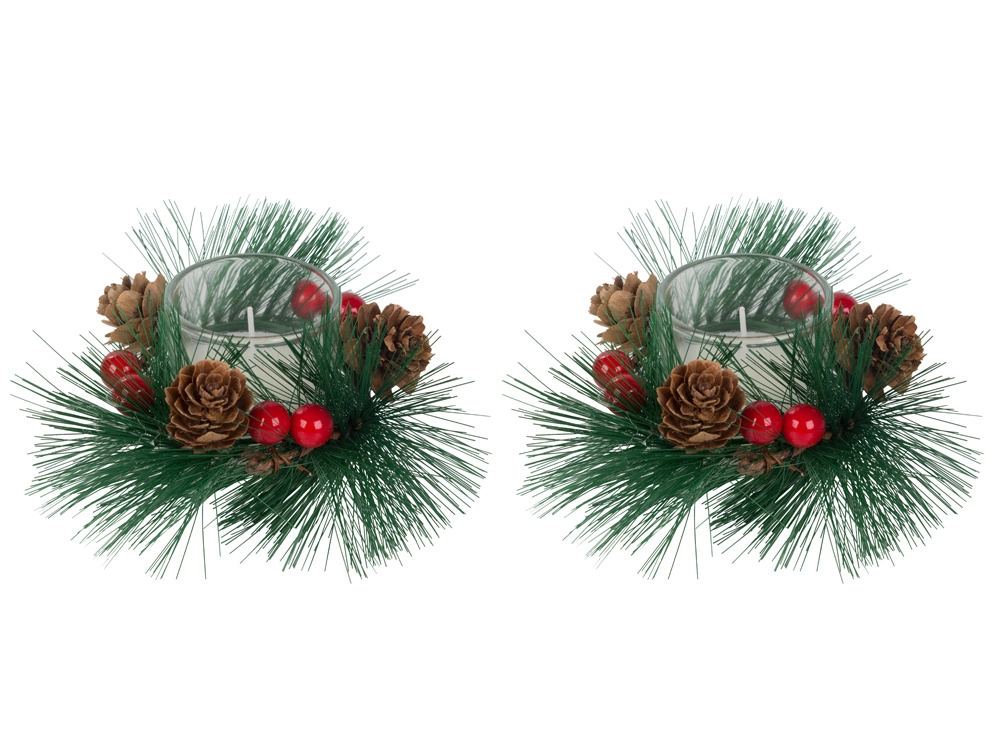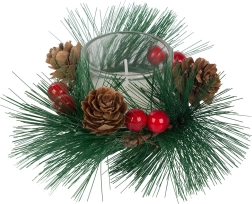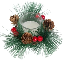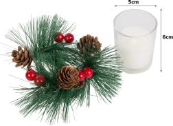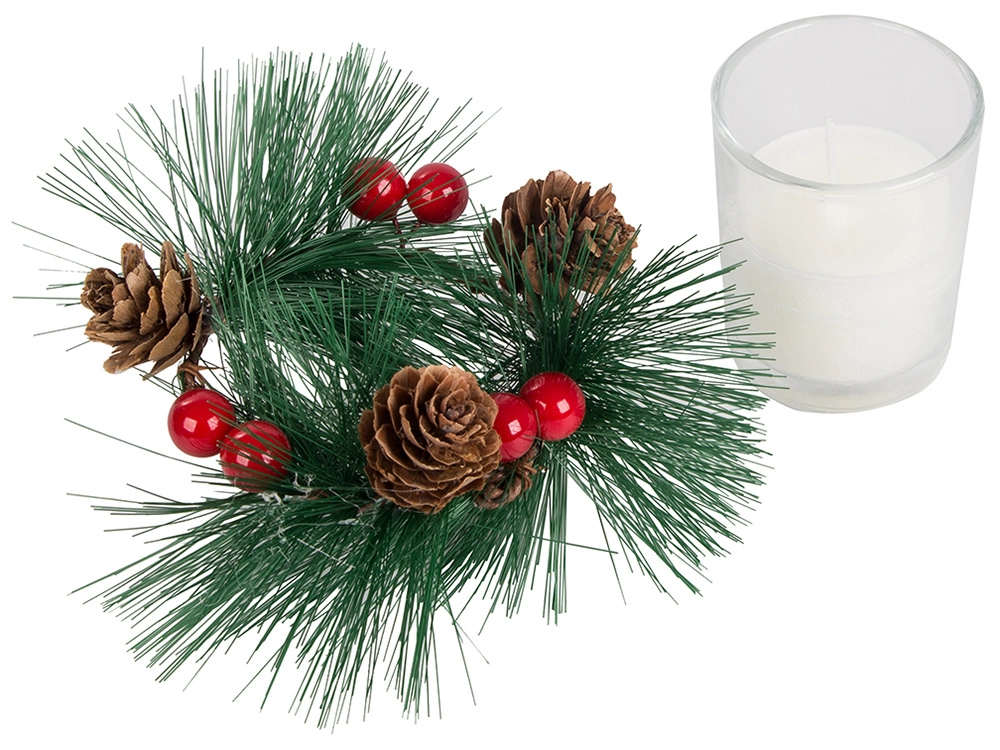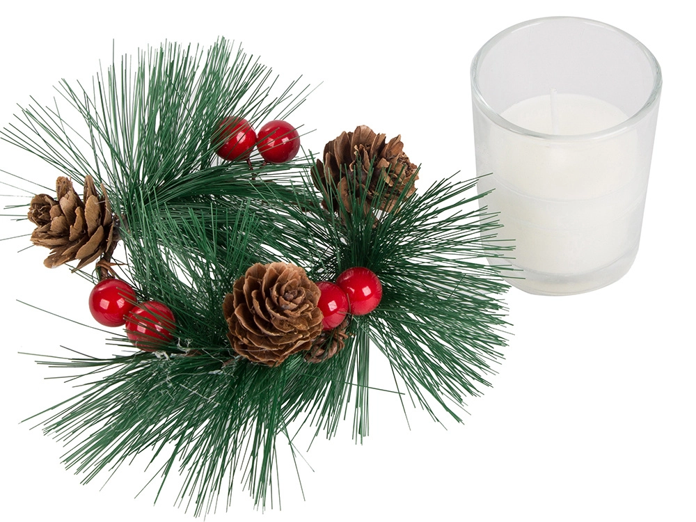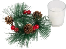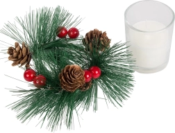 Šios dekoratyvinės žvakės kalėdinio vainiko stiliumi yra tobulas jūsų šventinio stalo ar lentynos akcentas. Pušų šakelės, kankorėžiai ir raudonos uogos aplink stiklinį žvakidę suteikia natūralaus kalėdinio žavesio.