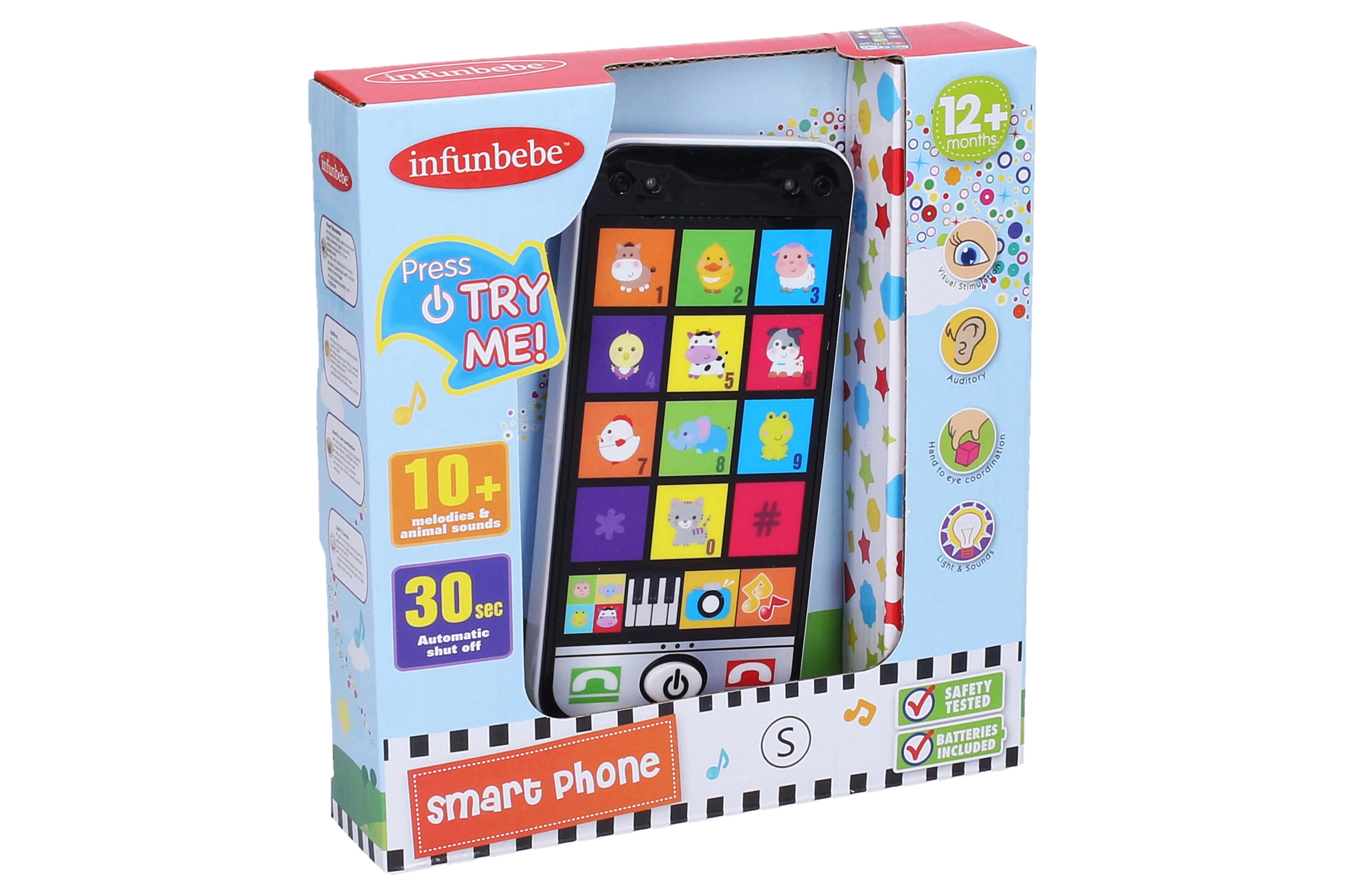 Smagus interaktyvus išmanusis telefonas mažiausiems imituoja tikrą lietimui jautrų telefoną ir lavina pojūčius bei motoriką. Siūlo šviesos ir garso efektus, 10 gyvūnų garsų mygtukų, 6 muzikos ir efektų mygtukus ir grojimo klavišais režimą. Automatiškai išsijungia po 30 sekundžių, todėl taupo bateriją.