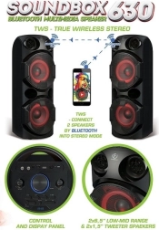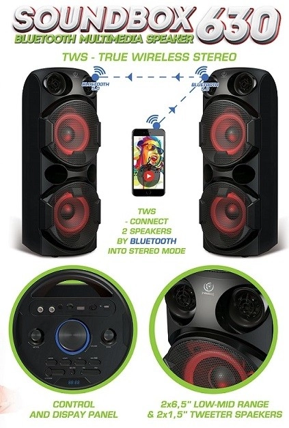 Nešiojamas Bluetooth garsiakalbis SoundBox 630 yra idealus bet kokiai vakarėlio atmosferai. Jis pasižymi puikiu jungiamumu ir LED apšvietimu, kuris sustiprina nuotaiką.