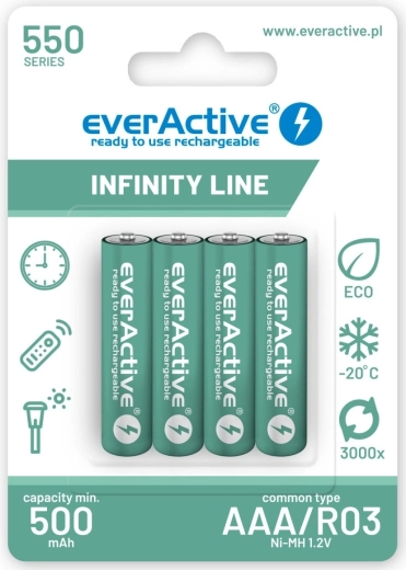 Rinkinys iš 4 AAA R03 akumuliatorių, kurių talpa 550 mAh ir paruoštos naudoti (ready to use) technologija – iškart tinkami naudojimui. Infinity Line serija idealiai tinka saulės šviestuvams, belaidžiams telefonams ir kitiems įrenginiams su mažu–vidutiniu energijos suvartojimu, kur puikiai pakeičia vienkartines baterijas ir suteikia ekonominę bei ekologinę naudą.
