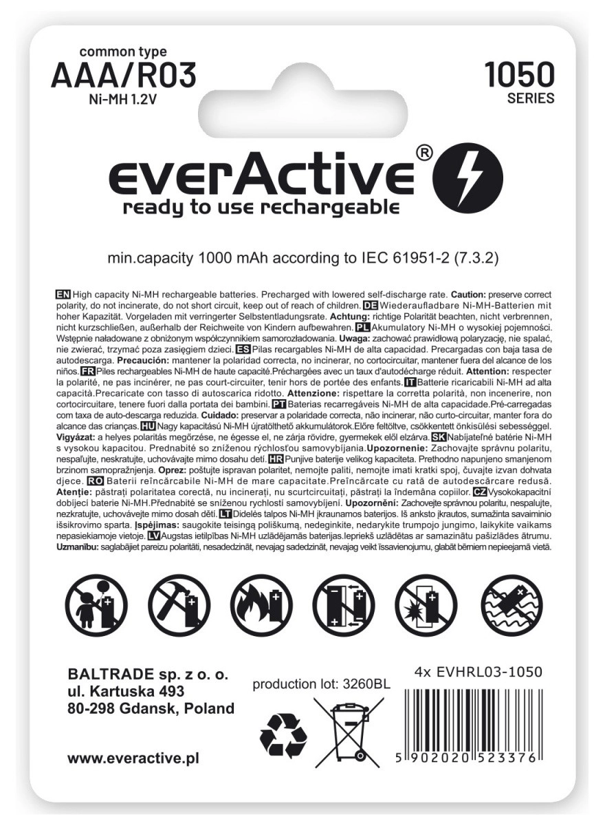 - Suderinamumas: visiškai pakeičia AAA/R03 baterijas įrenginiuose, kuriems reikia mažesnės srovės.