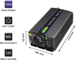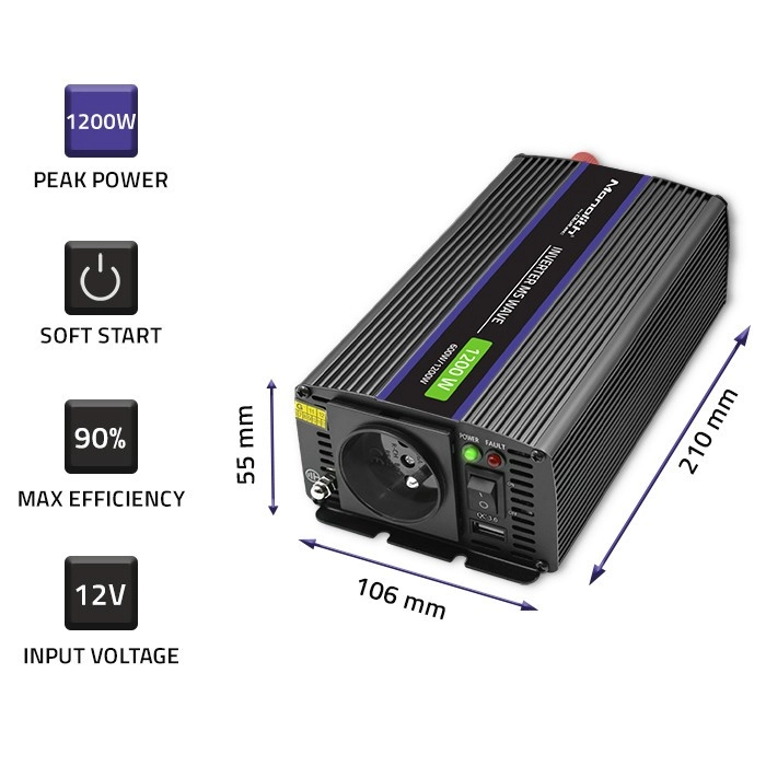 Ieškote universalaus energijos šaltinio kelionėms, kemperiui ar kaip atsarginio maitinimo? Šis keitiklis su modifikuotu sinusoidiniu signalu patikimai maitina įrenginius, kuriems nereikia gryno sinuso – pavyzdžiui, LED maitinimo šaltinius, įkroviklius, nešiojamuosius kompiuterius, kompiuterius ir smulkius prietaisus. Išėjimo kintamoji įtampa turi efektyvią vertę, prilygstančią 230 V tinklui, o paprasta konstrukcija užtikrina mažesnį gedimų dažnį ir ilgą tarnavimo laiką.