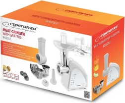 Daugiafunkcis elektrinis mėsos malūnėlis su tarkavimo priedu Esperanza RISSOLE – patikimas pagalbininkas kiekvienoje virtuvėje. Lengvai sumala mėsą ir kitas žaliavas, o su antgalių rinkiniu paruoš ir namines dešreles arba kebbe. Tarkavimo priedas puikiai tinka vaisiams, daržovėms, kietam sūriui, šokoladui ir riešutams. Stabilų darbą užtikrina neslystančios kojelės.