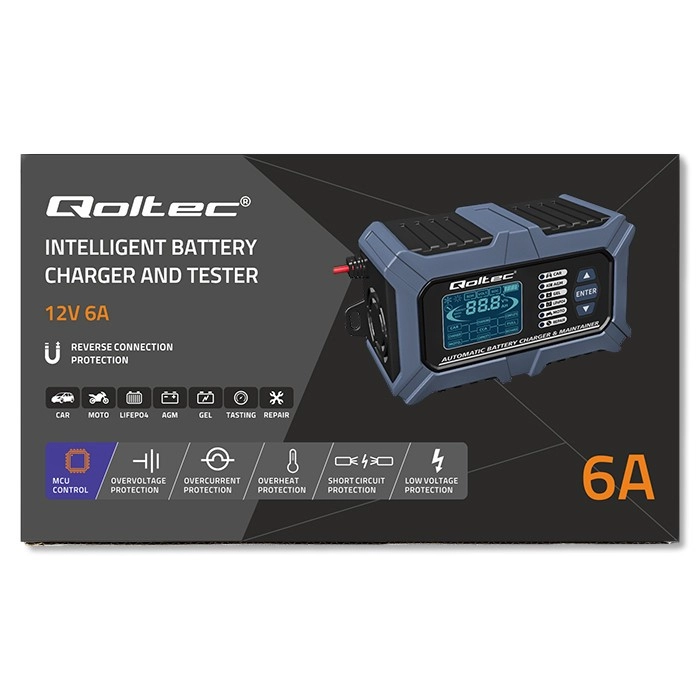 Išmanus QOLTEC 12 V akumuliatorių įkroviklis siūlo mikroprocesorinį valdymą, 6 veikimo režimus ir remonto (Repair) funkciją nusilpusiems akumuliatoriams atgaivinti. Dėl didelio LCD ekrano lengvai stebėsite įtampą, srovę ir pasirinktą režimą. Įkroviklis tinka AGM, GEL ir LiFePO4, gali testuoti akumuliatorių (įtampą, CCA, būklę) ir turi išsamias apsaugas nuo poliškumo supainiojimo, viršįtampos, perkaitimo ir trumpojo jungimo.