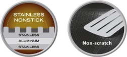 - Trisluoksnė konstrukcija (nerūd. plienas 430 / aliuminis / nerūd. plienas 304) tolygiam šilumos paskirstymui nuo centro iki kraštų.