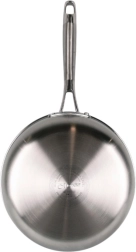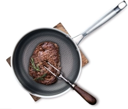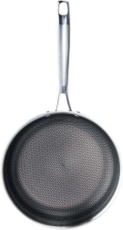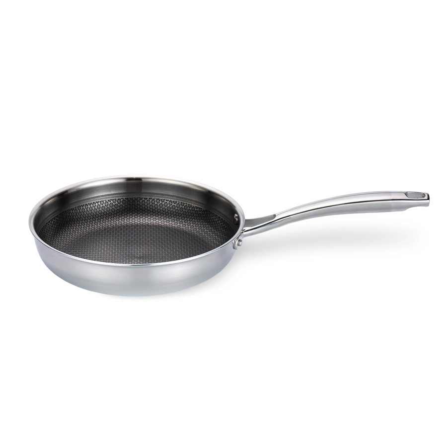 Tvirta nerūdijančio plieno keptuvė, 26 cm skersmens, sukurta tiksliems rezultatams ir ilgaamžiškumui. Trisluoksnis „sumuštinio“ dugnas jungia išorinį magnetinį 430 plieną, aliuminio šerdį tobulam šilumos laidumui ir vidinį 304 maistinį nerūdijantį plieną. Tekstūruotas paviršius su šešiakampiu „koriuotu“ raštu didina atsparumą įbrėžimams ir padeda nepridegti.