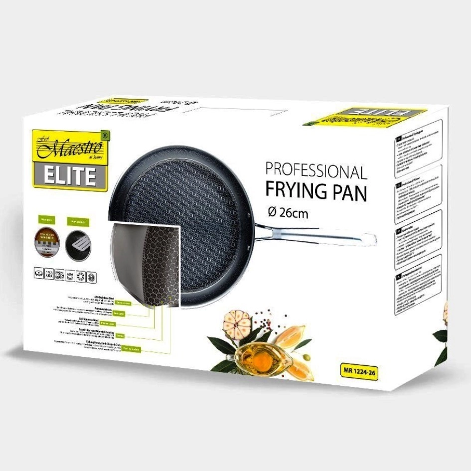Profesionali nerūdijančio plieno keptuvė MAESTRO, 26 cm skersmens, užtikrina greitą ir tolygų įkaitimą, patvarų trijų sluoksnių korpusą ir nepridegantį, koriuotą paviršių, tinkamą kasdieniam gaminimui namuose ir gastronomijoje. Ji tinka visų tipų viryklėms, įskaitant indukcines, saugi orkaitėje iki 260 °C ir galima plauti indaplovėje.
