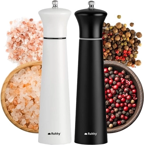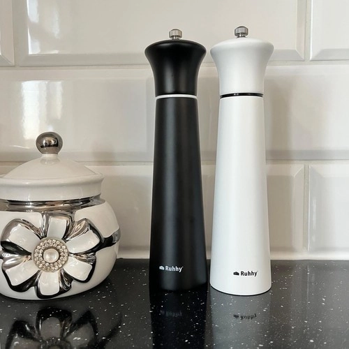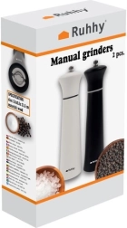 Elegantiškas dviejų rankinių RUHHY malūnėlių rinkinys juodos ir baltos spalvos šviežiai malonai druskai ir pipirams. Siūlo keraminį malimo mechanizmą, sklandų malimo stambumo reguliavimą ir ergonomišką formą patogiam naudojimui. Dėl kokybiškų medžiagų ir modernaus dizaino malūnėliai yra patvarūs, tikslūs ir lengvai valomi.