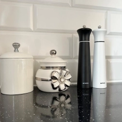 Apgalvota konstrukcija leidžia patogiai pildyti atsukant viršutinį ratuką ir dangtelį. Matinis juodos ir baltos spalvos paviršius tinka bet kuriai virtuvei ir lengvai prižiūrimas – pakanka nuvalyti sausa šluoste. Puiki idėja stilingai dovanai gaminimo mėgėjams.