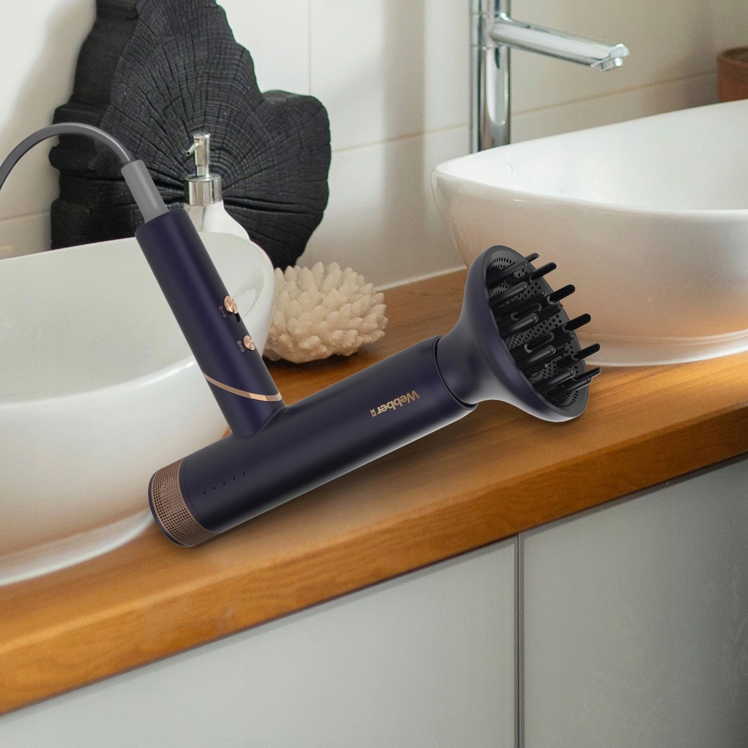 Ieškote patikimo, galingo ir tylaus džiovintuvo kasdienei plaukų priežiūrai? WEBBER STELLA sujungia joninę priežiūrą glotniai ir blizgiai išvaizdai be statinės elektros, tikslų oro srauto ir temperatūros reguliavimą bei ergonomišką dizainą patogiam laikymui. Su nuimamais antgaliais lengvai sukursite tikslias fenuotes ir natūralias bangas.