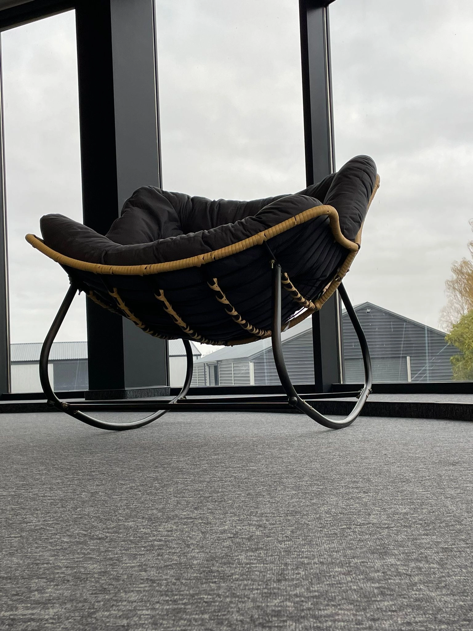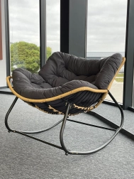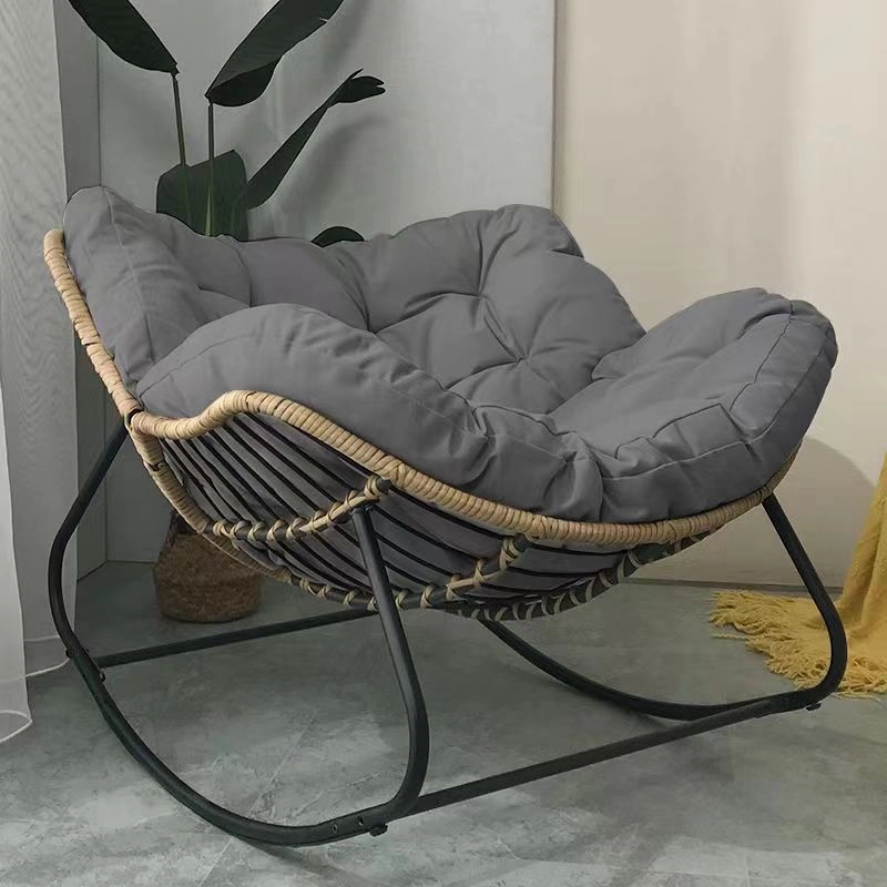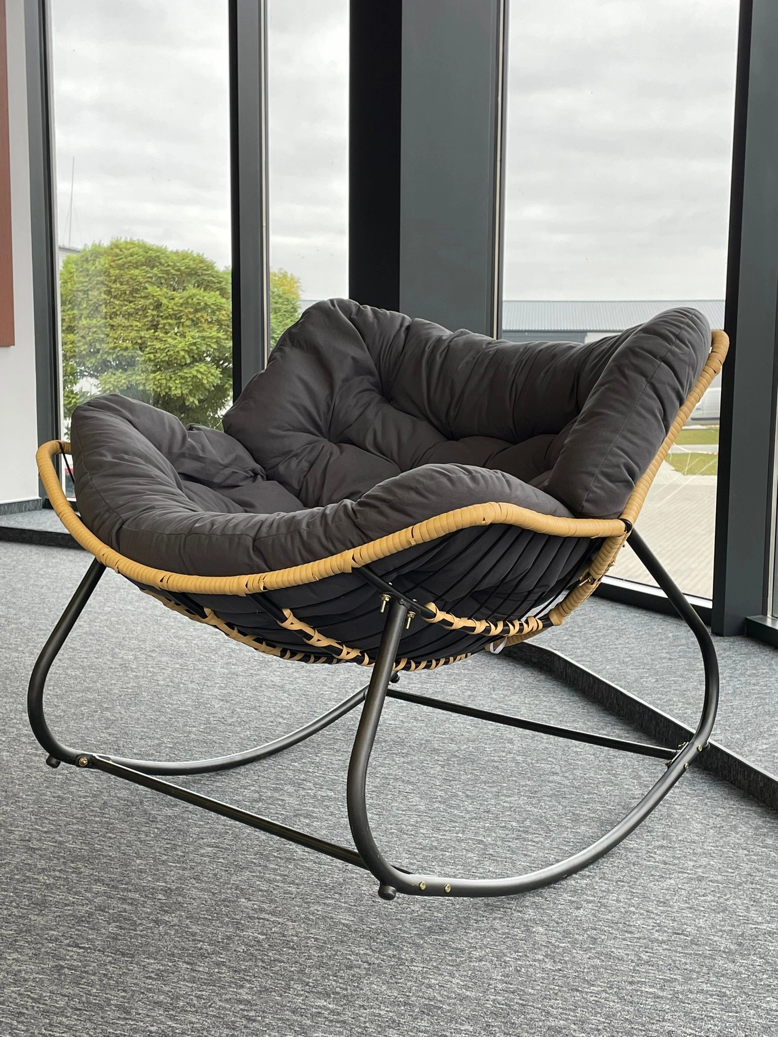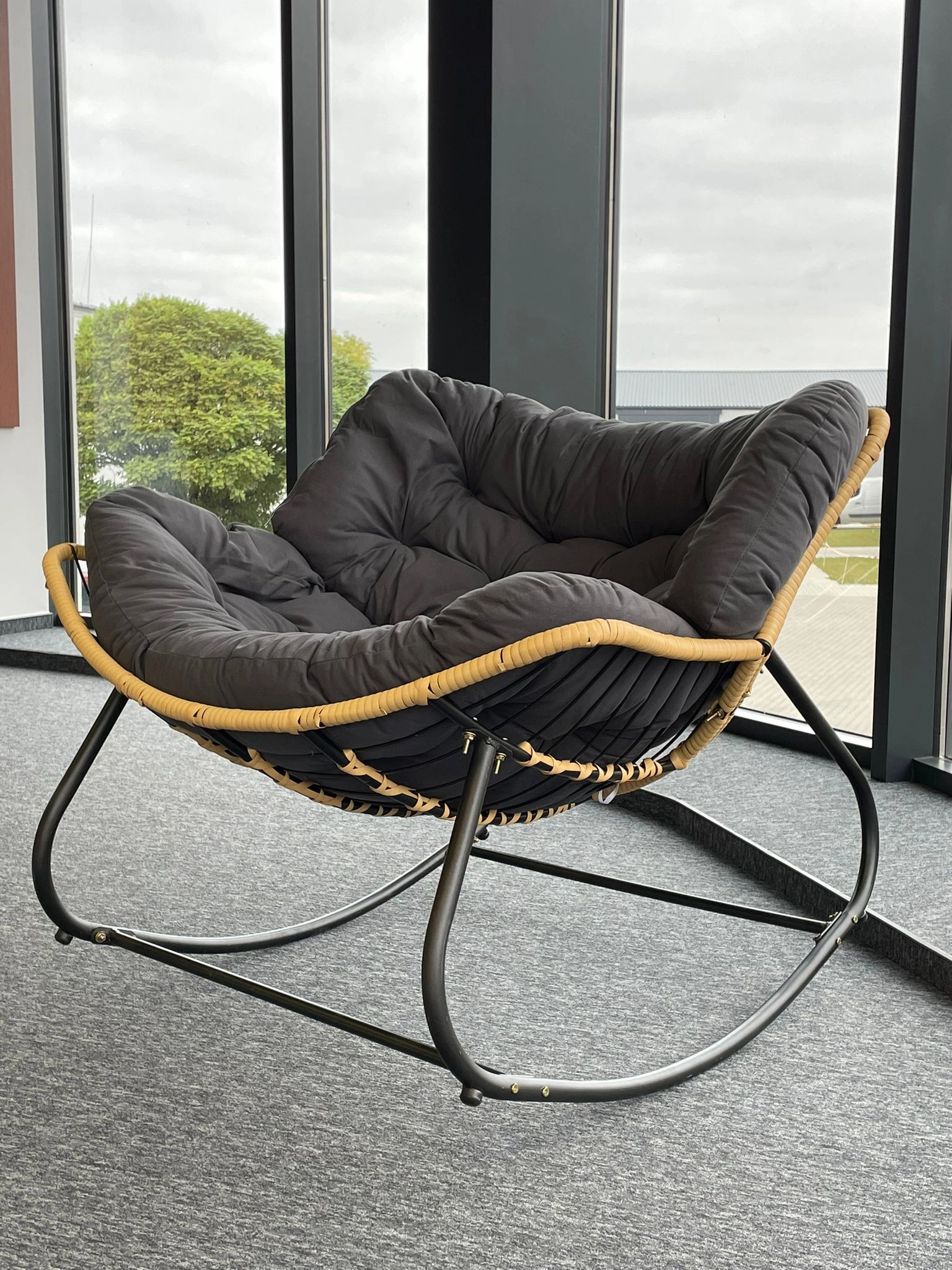 Mėgaukitės poilsiu moderniu stiliumi: šis pilkos spalvos supamasis krėslas dera natūralios rotango išvaizdos, minkštą pagalvėlę ir tvirtą metalinę konstrukciją. Dėl didelės keliamoios galios ir patvarių medžiagų puikiai tinka svetainei, miegamajam ir reprezentatyvioms komercinėms erdvėms.