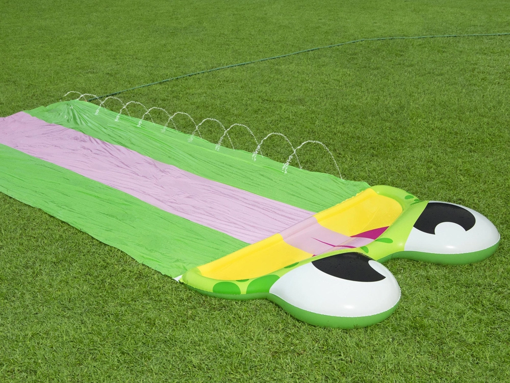 Montavimas greitas ir paprastas – tiesiog ištieskite čiuožyklą ant žolės, prijunkite sodo žarną ir pramogos gali prasidėti!