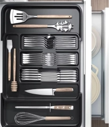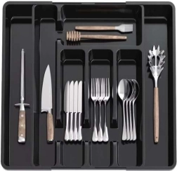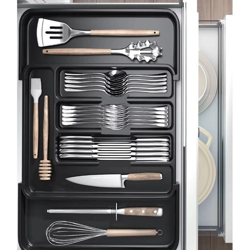 Maksimizuokite vietą stalčiuje dėl išmanaus išplečiamo dizaino. Organizatorių galima sklandžiai sureguliuoti įvairiems stalčių pločiams, todėl stalo įrankiai, peiliai ir samčiai visada bus tvarkingai sudėti. Patvarus PP korpusas užtikrina ilgą tarnavimo laiką, atsparumą įbrėžimams ir paprastą priežiūrą.