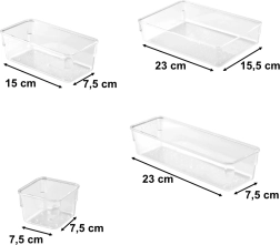 Šis universalus organizatorių rinkinys jungia švarią estetiką ir praktinį funkcionalumą. Skaidrus dizainas leidžia akimirksniu matyti turinį, o skirtingi dydžiai padeda lengvai pritaikyti išdėstymą kiekvienam stalčiui, lentynai ar darbo paviršiui.