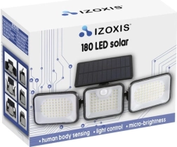 Galinga saulės lempa IZOXIS su 180 LED, PIR judesio jutikliu ir sutemų jutikliu patikimai apšviečia sodą, įėjimą, garažą ar terasą. Siūlo 550 lm ryškumą, 3 reguliuojamus skydelius iki 300° plačiam apšvietimo kampui, IP65 atsparumą vandeniui ir ilgą veikimo laiką – 8–10 val. po pilno įkrovimo – be elektros sąskaitų.
